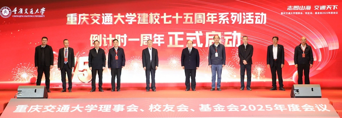 2026年是重庆交通大学建校75周年的荣耀时刻,在这承前启后、继往开来的重要历史节点,学校隆重举行建校75周年倒计时一周年启动仪式。在与会嘉宾的共同见证下,学校党委书记宫辉,国家铁路局原党组成员、中国交通运输协会副会长钟华,校友会会长唐伯明,交通运输部原总工程师兼水运局局长李天碧,国家发改委农经司原司长吴晓,理事会副理事长、重庆市交通委员会原主任乔墩、广西交投集团原董事长周文、中国华西工程设计建设有限公司董事长周华、福建省交通运输厅党组成员、总工程师寇军,学校副校长董绍江,共同为建校75周年系列活动倒计时一周年启动仪式剪彩!
